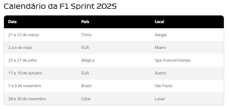 A Fórmula 1 e a FIA anunciaram hoje os locais que sediarão eventos da F1 Sprint durante a temporada de 2025, com seis circuitos programados para sediar os 100 km rasos na próxima temporada.