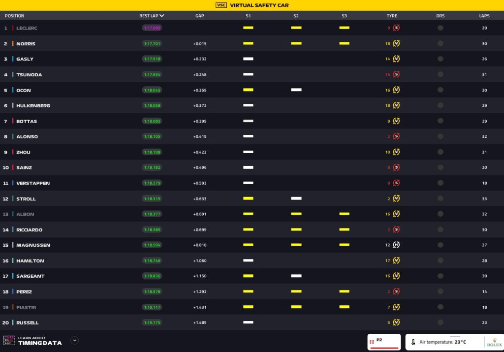 Treino encerrado, desta vez com tempo seco, com Leclerc em P1, Norris em P2 e Gasly em P3. Tsunoda fechou em P4 a frente de Ricciardio, apenas em P14. Sainz é P10, Verstappen P11, Hamilton P16 e Perez P18.