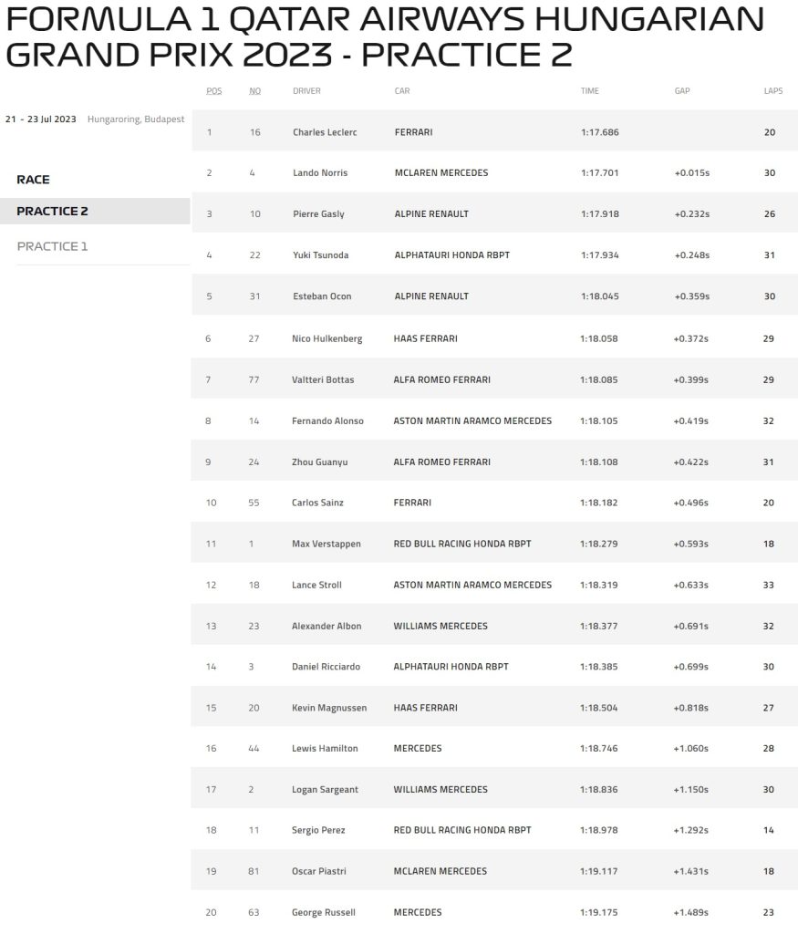 - Aston Martin: Foi um dia tranquilo para a Aston Martin, com ambos os pilotos se mantendo longe de problemas e administrando muitas voltas. Ambos saíram em intermediários no TL1 para experimentar as condições molhadas, e depois correram tanto os macios quanto os médios no TL2. O seu verdadeiro lugar na ordem dos bicos continua a ser uma incógnita graças a tantos programas diferentes que estão em exibição. Fernando Alonso disse: “Foi um dia misto, com alguma chuva e condições de vento em Hungaroring. Perdemos tempo no TL1 e não tivemos muito tempo de pista, mas foi o mesmo para todos. Acho que maximizamos o TL2 e coletamos muitos dados úteis, especialmente na preparação para as condições de corrida. Geralmente, estou muito feliz com o dia de hoje e vamos ver o que podemos fazer amanhã na classificação com condições esperançosamente secas.” Lance Stroll disse: “Foi bom estar de volta à pista em Hungaroring hoje; é um circuito que gosto muito de pilotar. Tivemos corridas limitadas no TL1, registrando apenas cerca de 10 voltas devido à forte chuva. O TL2 ficou mais ocupado com alguns itens de teste diferentes para rodar no AMR23. Felizmente, a chuva resistiu e conseguimos um bom número de voltas e trabalhamos uma boa parte do programa. Acho que ainda há algumas mudanças que podemos fazer antes da classificação, então vamos trabalhar nossos aprendizados esta noite e olhar para amanhã.”