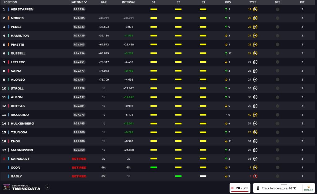 Que corrida sensacional novamente para Max Verstappen, sua 7ª vitória seguida, a 12ª vitória seguida da Red Bull. Lando Norris novamente sensacional chega em segundo com Perez tentando a dobradinha mas tendo que se contentar com a P3.Hamiltom P4 com Piastri em P5. Ricciardo termina a frente de Tsunoda, adotando acertadamente uma estratégia de uma parada a mais, conseguindo um incrível stint de 40 voltas.