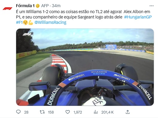 - Williams: A Williams não esperava que esta pista se adequasse demais ao seu carro, então eles devem ser agradavelmente surpreendidos com sua corrida de sexta-feira. Eles passaram grande parte do TL2 no top 10 antes de serem atropelados por alguns retardatários, mas no geral o FW45 parecia razoavelmente bem plantado lá fora. Com a forma de classificação de Albon parecendo boa e Sargeant crescendo em estatura, tudo parece positivo para amanhã. Logan Sargeant disse: “Foi um primeiro dia desconexo aqui em Budapeste, com condições mistas entre TL1 e TL2. O carro está em uma janela decente, mas há muito para encontrar antes de amanhã e muito trabalho para fazer durante a noite.” Alex Albon disse: “Foi um bom dia para nós, com o carro se sentindo bem lá fora, e sendo possível colocá-lo em uma janela bastante decente. Ele destaca que não é uma pista que realmente nos convém, então mesmo que o carro tenha se sentido bem, em relação aos nossos rivais, ainda nos falta um pouco de ritmo, o que é de se esperar. No entanto, pensando nisso do ano passado, o carro é uma boa melhora, mas ainda precisamos fazer um pouco mais para amanhã se quisermos entrar no Q2.” Dave Robson, Chefe de Desempenho dos carros disse: “Embora o TL1 tenha sido interrompido por alguma chuva e bandeiras vermelhas, tivemos um dia decente. Este é o primeiro dos eventos da ATA (fim de semana modificado), o que levou a alguns planos de corrida alternativos entre as equipes, mas estamos felizes com o que escolhemos fazer, e veremos amanhã como isso se desenrola. Ambos os pilotos estavam mais felizes com seus carros. No entanto, faremos algumas mudanças durante a noite, à medida que procuramos ficar à frente das mudanças nas condições da pista. O carro está muito melhor aqui do que no ano passado, mas o Hungaroring ainda não combina com os pontos fortes naturais do FW45. Vamos nos esforçar o máximo possível amanhã e buscar usar o novo formato de classificação para nos ajudar a alcançar um bom resultado. A corrida será desafiadora, mas com ultrapassagens geralmente difíceis aqui, qualquer lugar que possamos fazer amanhã nos ajudará a alcançar um resultado forte no domingo.”