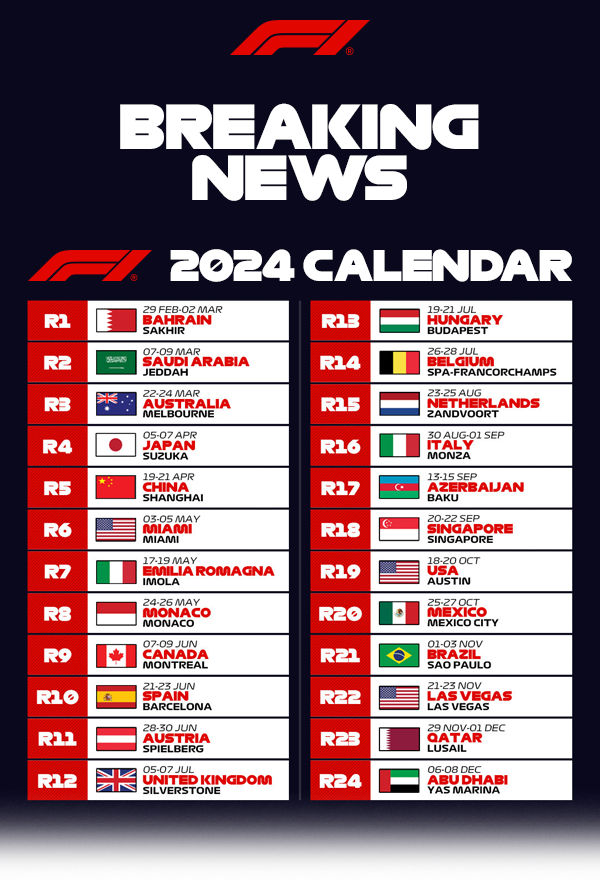 - A Fórmula 1 anunciou o calendário do Campeonato Mundial de Fórmula1 de 24, aprovado pelo Conselho Mundial de Automobilismo. A Fórmula 1 deixou clara sua intenção de avançar para uma maior regionalização do calendário, reduzindo os encargos logísticos e tornando a temporada mais sustentável. Ao transferir o Japão para abril, o Azerbaijão para setembro e o Qatar consecutivamente com Abu Dhabi, este calendário cria um melhor fluxo de corridas em certas regiões, e esse trabalho continuará sendo realista ao fato de que, como um campeonato mundial, com restrições climáticas e contratuais, sempre haverá viagens necessárias que não podem ser completamente regionalizadas. Para as duas primeiras corridas da temporada, no Bahrein e na Arábia Saudita, o GP será realizado em um sábado. Esta decisão foi tomada para acomodar o Ramadão.