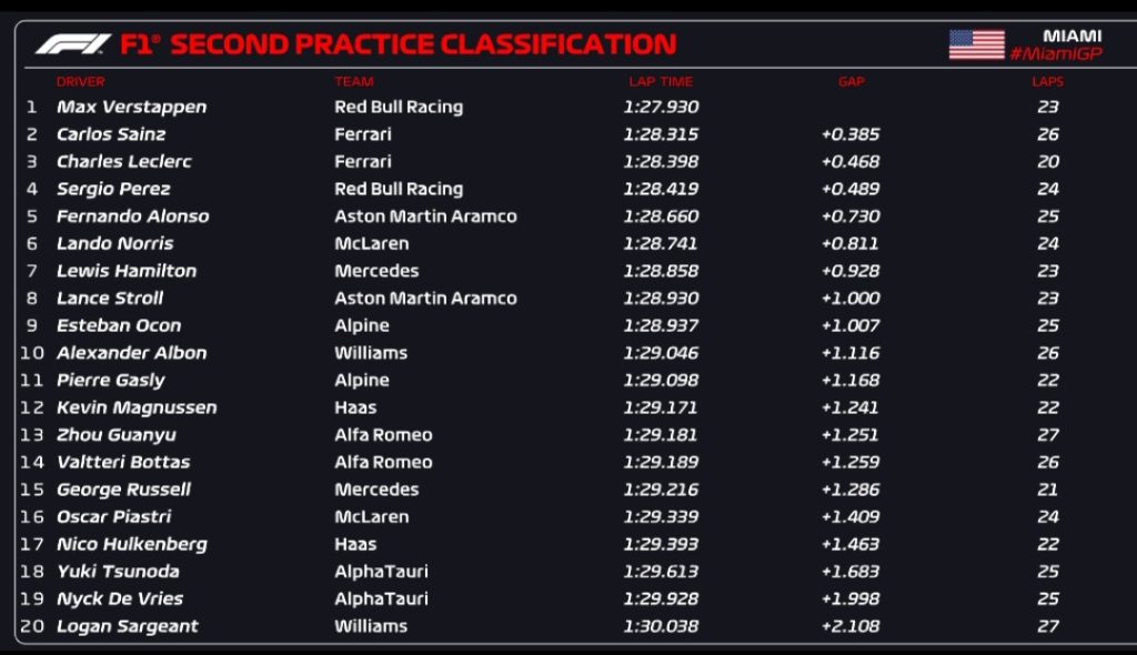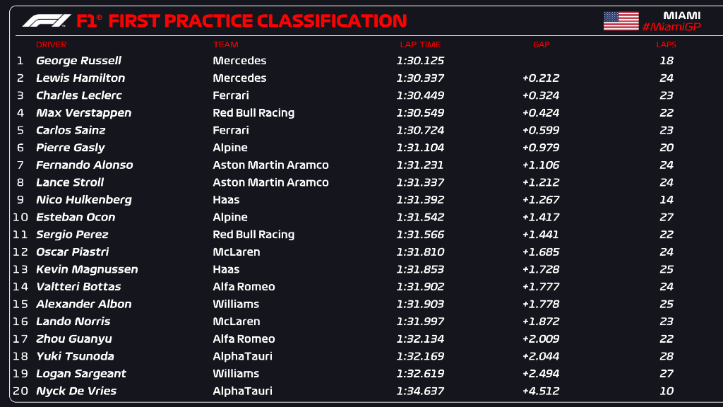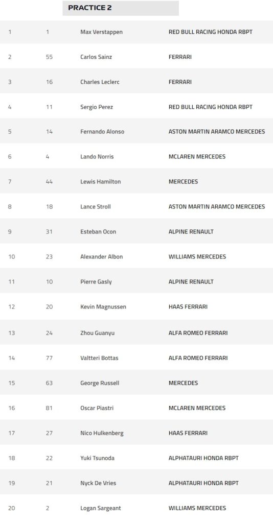O líder do FP1, George Russell, abriu a curva na Curva 11 pouco antes da queda de Leclerc na Curva 7 e terminou em P15, à frente de Oscar Piastri, da McLaren. O próximo no quadro foi Nico Hulkenberg, da Haas, que caiu no FP1, mas chegou ao P17 no FP2 após um notável trabalho de reparo da equipe.