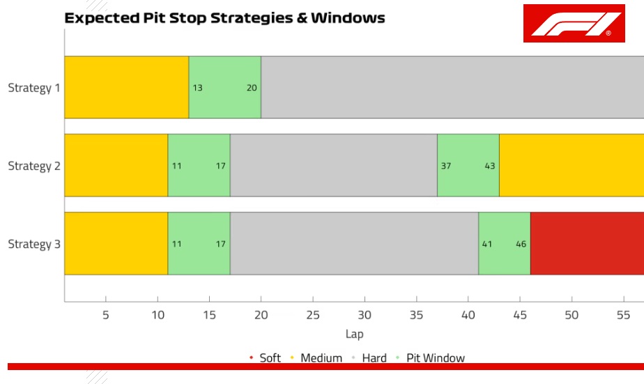 - Qual é a estratégia mais rápida? Pode parecer surpreendente em uma pista que se mostrou extremamente complicada para os pilotos lidarem com os níveis flutuantes de aderência, mas uma parada é a estratégia favorita que a maioria terá como alvo neste momento. Isso deixa uma estratégia mais rápida de começar com o pneu de composto médio, para garantir um forte desempenho fora da linha e nos estágios iniciais, antes de mudar para o duro em qualquer lugar entre a volta 13 e a volta 20. O pneu duro é considerado um pneu de corrida realmente consistente com base no que foi visto durante os treinos, sem problemas de aquecimento graças às altas temperaturas e boa durabilidade mesmo com muito combustível. O médio também é muito consistente, então o primeiro stint também pode ser estendido além da volta 20 para carros com pneus bons, aumentando a chance de poder tirar proveito de qualquer possível Safety Car / Safety Car virtual ou interrupções de chuva. Um pit stop sob condições de bandeira verde é cerca de oito segundos mais longo do que um realizado quando a velocidade do grid é limitada pelo controle da corrida.