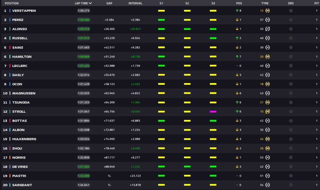 E deu ele Max Verstappen, incrivelmente conseguindo levar o carro longe o bastante rendendo com pneus duros e velhos, para quando fizesse a sua única parada, tivesse os pneus novos que facilitariam muito sua ultrapassagem para cima do companheiro Perez que chegou em P2. Perez fez o que pode, pois ele não é o Max. Alonso conquista um P3 sensacional, mostrando que ele é o melhoro dos outros.