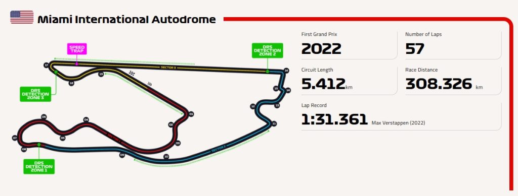 Tendo feito sua estreia na F1 em maio de 2022, o Autódromo Internacional de Miami é um circuito temporário, mas projetado para ter uma sensação permanente. Ambientada no complexo Hard Rock Stadium, em Miami Gardens, lar da famosa franquia Miami Dolphins da NFL, a pista é o ápice de um processo de desenvolvimento que simulou nada menos que 36 layouts diferentes antes de se estabelecer em uma emocionante corrida que fornece uma vibração de circuito de rua, não muito diferente do Albert Park de Melbourne. O GP inaugural de Miami aconteceu em 2022, a corrida da Flórida se juntando à sua contraparte texana em Austin para se tornar a segunda corrida dos EUA no calendário e a 11ª local diferente dos EUA a sediar uma etapa do campeonato mundial de Fórmula 1. É um espetáculo de rua. Com o Hard Rock Stadium em seu epicentro, o traçado de 5,41 km apresenta 19 curvas, três retas, três zonas de DRS e velocidades máximas de mais de 340 km/h. Há também mudanças de elevação, a principal encontrada entre as curvas 13 e 16, com a pista passando por cima de uma rampa de saída e sob vários viadutos em terreno irregular. A chicane da curva 14-15, por sua vez, tem uma aproximação de subida, com uma crista no meio, e depois cai na saída, para entrar na grande reta. De tirar o fôlego.