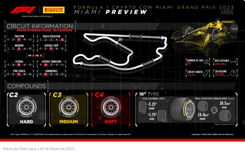 - A F1 viaja diretamente do Azerbaijão para os Estados Unidos para a segunda edição do GP de Miami, com a fornecedora de pneus Pirelli explicando suas escolhas de compostos. A Pirelli trouxe os compostos C2, C3 e C4, do meio de sua gama, para o Autódromo Internacional de Miami neste fim de semana, o mesmo que suas indicações para Arábia Saudita e Austrália. “Na primeira corrida realizada na pista ao redor do Hard Rock Stadium no ano passado, os pneus se comportaram como esperado no asfalto, que tinha características bastante particulares, sobretudo devido a uma ‘micro-rugosidade’ muito alta. Sabemos que a pista já foi completamente recapeada e teremos que verificar durante a inspeção habitual que antecede o início do fim de semana se haverá alguma mudança significativa em suas características. A pista de Miami exige níveis médios de downforce, pois apresenta uma grande variedade de curvas, mas também uma reta muito longa. Trouxemos os pneus médios da gama (C2, C3 e C4), também pelo fato de que podemos esperar temperaturas muito altas: no ano passado, o asfalto chegou a quase 60°C.”