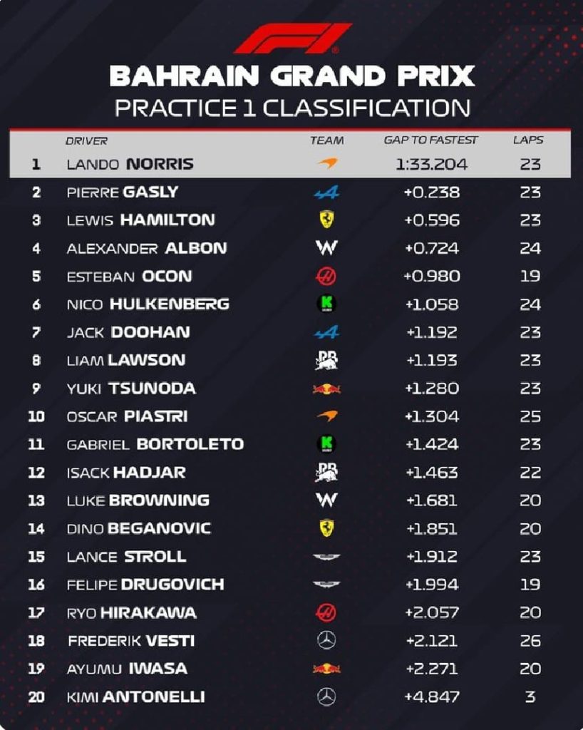 Lando Norris liderou os quadros de horários durante a sessão de treinos de abertura do Grande Prêmio do Bahrein, o piloto da McLaren foi mais rápido que Pierre Gasly e Lewis Hamilton em uma hora que contou com aparições de seis novatos. Tudo isso poucos dias depois de correr em condições frias no Circuito de Suzuka, no Japão, as equipes e os pilotos voltaram à ação em meio ao clima quente e ensolarado em Sakhir para o Free Practice de sexta-feira. Vários do grid atual, no entanto, não estariam ficando atrás do volante, tendo entregue seus carros a um jovem piloto como parte da regra estipulando que as equipes devem executar novatos em quatro sessões de TL1 durante a temporada.