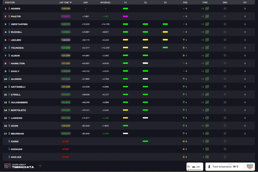 Volta 27/57 e as McLarens dominam. Norris é líder a 1.3 de Piastri, com 15 segundos de diferença para Verstappen. Quem diria? Verstappen tem problema de desempenho na chuva. McLaren começa o campeonato muito bem, e o mesmo não se pode dizer da Red Bull, pelo menos na chuva. Mas essa qualidade da McLaren já se viu na metade final da temporada do ano passado.