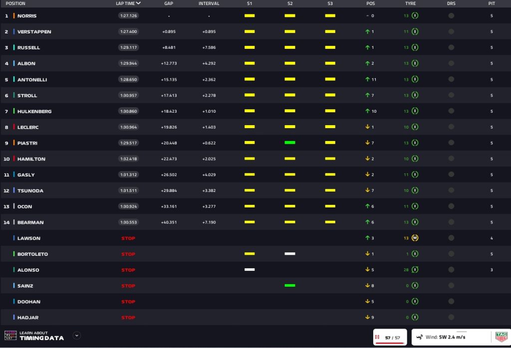 Corrida cheia de emoções pois a chuva volta pegando os pilotos de surpresa, apesar de serem avisados pelo box. Isso causa uma rodada de Piastri que fica na grama, mas em uma manobra lenta consegue retornar a pista, porém perdendo muitas posições. Lando também sofre com isso e Max Verstappen assume a ponta, mas Lando segue vivo. Incrível. Pilotos da McLaren entram no box para colocar pneus de chuva. Max se mantem com pneus slick. Hamilton assume a segunda posição com Gasly em terceiro. Na próxima volta Max para, pois a chuva forte aparece. Bandeira amarela, com Lian Lawson e Gabriel Bortoleto batendo. E foi estranho no caso de Bortoleto, pois a suspensão quebrou antes da batida. Lembrando que a Red Bull não quis Tsunoda escolhendo Lawson, e pelo menos nesse começo, parece que erraram, pois o fim de semana de Lawson foi horrivel. Tsunoda é P11, mas segue na pista. Os novatos não começaram bem na chuva, exceto Antoneli que se mostra bom de chuva. Lando Norris retorna a ponta, volta 48 de 57. Piastri perdeu muito tempo e é o P13 e voltamos ao Safety car.