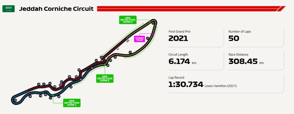 O Circuito Corniche de Jeddah, como você não se surpreenderá, é um circuito de rua temporário (embora adornado com algumas seções permanentes), localizado na Corniche – uma área turística costeira de 30 km da antiga cidade saudita de Jeddah. Projetado pela empresa Tilke, em conjunto com a própria equipe de automobilismo da Fórmula 1 – que utilizou o Google Earth para suas investigações iniciais sobre possíveis traçados – o objetivo era um circuito rápido e amplo que realmente desafiasse os pilotos. O Grande Prêmio inaugural da Arábia Saudita ocorreu em 2021, juntando-se às suas contrapartes do Oriente Médio no Bahrein e em Abu Dhabi. Assim como essas corridas, o Grande Prêmio da Arábia Saudita também acontece sob holofotes. Ele é rápido. Muito rápido. As velocidades médias no Circuito Corniche de Jeddah giram em torno de 250 km/h – mais rápidas que as de Silverstone e o segundo no calendário, atrás apenas de Monza – também conhecido como “O Templo da Velocidade”. É, simplesmente, o circuito de rua mais rápido já visto na Fórmula 1 – e a pista também apresenta o maior número de curvas do calendário, com 27, muitas delas curvas rápidas e sinuosas, enquanto os pilotos percorrem a orla de Jeddah.