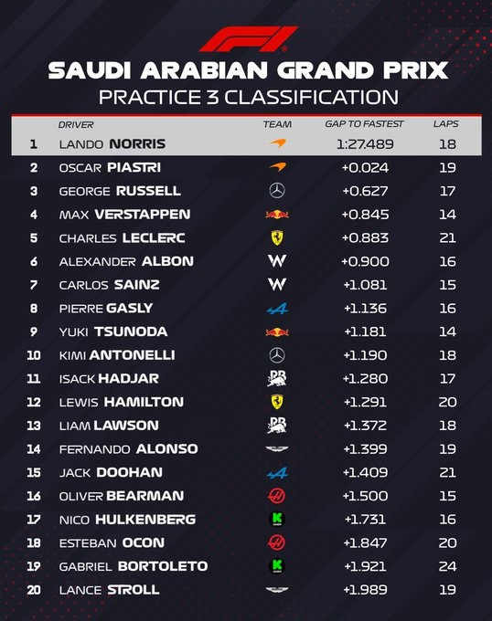 Em um final de semana em que até aqui, Max Verstappen esteve sempre próximo das fortes MacLarens, ele mostra força e conquista a pole position. Primeiro foi Russel, depois Piastre e por fim, no apagar das luzes, Max Verstappen. O Holandês largará ao lado de Piastre, no que tem tudo para ser um GP emocionante.Leclerc fecha a seginda fila em P4. Antonelli semrpe forte e um (surpreendente?) Sainz vem na sequência.