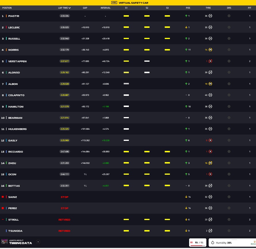 Corrida fantástica, cheia de atrativos, onde Leclerc, o pole position, manteve a ponta, mas logo não foi forte o suficiente para manter a primeira posição, apesar de aparentemente ter carro apra isso, sendo ultrapassado por Piastri. Leclerc bem que tentou recuperar a posição, mas Piastri foi defensivo o suficiente, ficando Leclerc tendo que se contentar com a segunda posição. Russel é o terceiro, com Lando Norris conquistando, também pela batida, uma posição melhor ainda, em quarto. Verstappen, que reclamou constantemente dos freios, acabou, no final, sendo ultrapassado por Lando Norris, ficando em quinto. A McLaren assume a ponta no Mundial de Construtores. Sainz e Perez, na penúltima volta, fazem disputa por posição, e acabam batendo. Os dois podiam ter evitado, então vamos aqui chamar de acidente de corrida. Incrível como o Perez quando não é bom, é azarado. Nenhum deles hesitou, e a batida aconteceu. Com isso, Colapinto chega em oitavo, com Bearman em décimo, ambos fazendo história e pontuando.