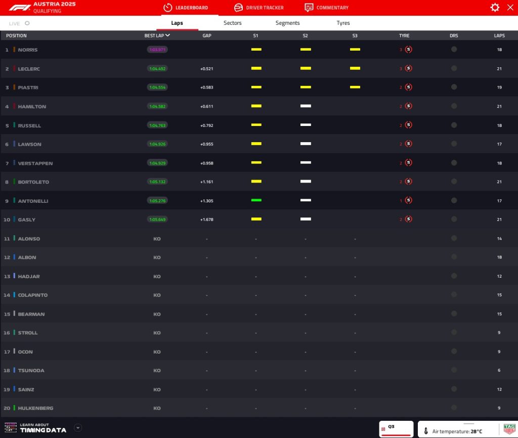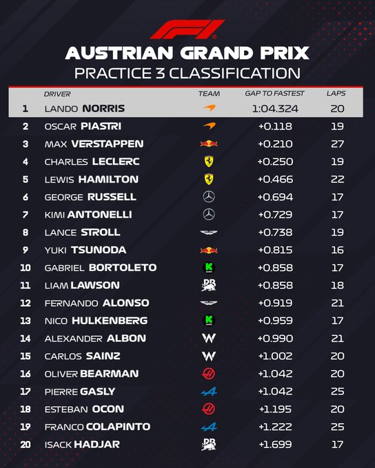 O vice-líder do Mundial de Pilotos, Lando Norris, mostrou velocidade no treino qualificatório para o GP da Austria fazendo a pole position e colocando um grande tempo de diferença, mais de meio segundo. Essa é a maior margem de pole da temporada até agora. Ao seu lado, largará a Ferrari de Leclerc. O lider do campeonato, Oscar Piastri, abre a segunda fila logo atrás do comanheiro de equipe, com Hamilton, que teve também um bom desempenho, a seu lado. Russel largará em P5, com Lawson conseguindo um impressionante P6, a frente do seu colega de Red Bull, Max Verstappen, que é apenas o P7. Cabe lembrar que Max foi prejudicado por uma bandeira amarela tardia. Ao lado de Verstappen no grid, largará o brasileiro Gabriel Bortoleto, pelo esforço próprio, mas também por conhecer bem a pista e vir com um acerto muito bom em sua Kick Sauber, conseguiu uma vaga inédita para ele e para a Sauber no Q3 e vai largar em P8. O brasileiro largará a frente de Anonelli, da Mercedes.