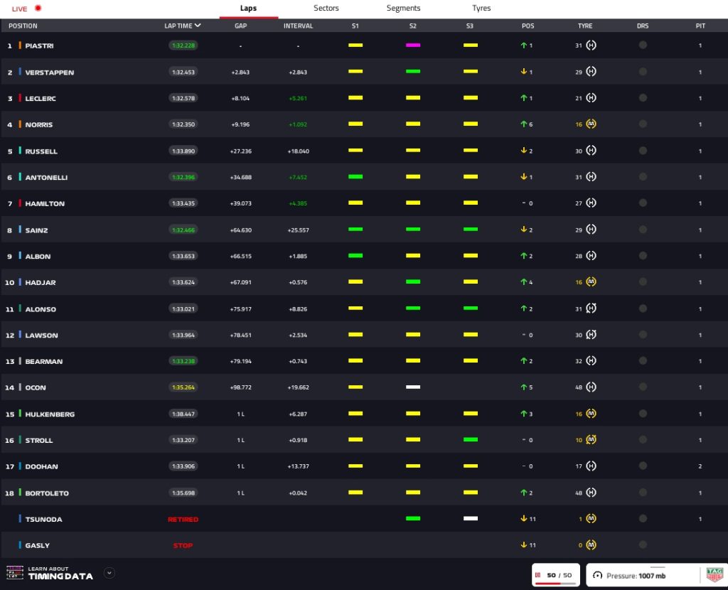 - Piastri ultrapassa Hamilton com pressa e sem dificuldade na volta 22/50 e já é o P3. Lando é P2 e Leclerc P1. O brasileiro Bortoleto ganha 5 posições desde o início da prova, os dois que abandonaram, mais Lawson, Alonso e Bearman. Lawson recupera a posição pra cima do brasileiro antes da frenagem da reta, assim como Alonso que veio no embalo. Bortoleto não viu Alonso, fechou para mudar a trajetória na curva, e quase causou um acidente completamente sem intenção. A FIA anotou o fato para verificação. Alonso foi por fora e devolveu a posição ao brasileiro. A volta é a 26/50 e Bortoleto é o P17. Alonso e posteriormente Bearman fazem a ultrapassagem pra cima de Bortoleto, que tem ritmo menor. Bortoleto agora é o último na pista.