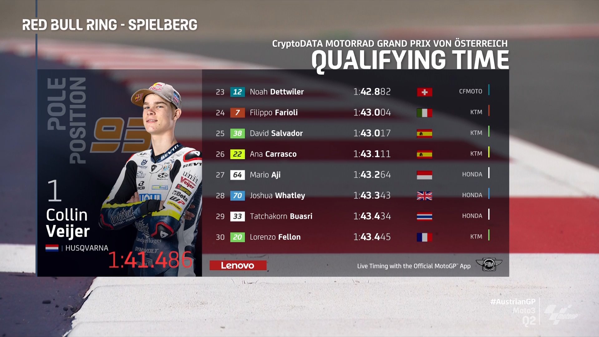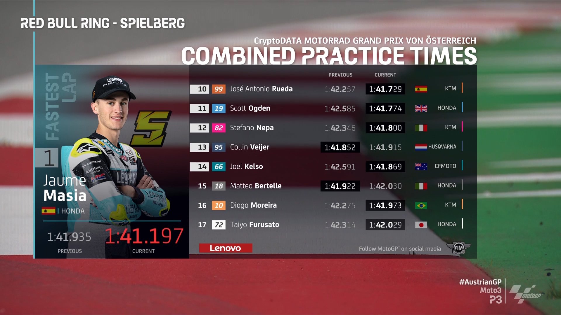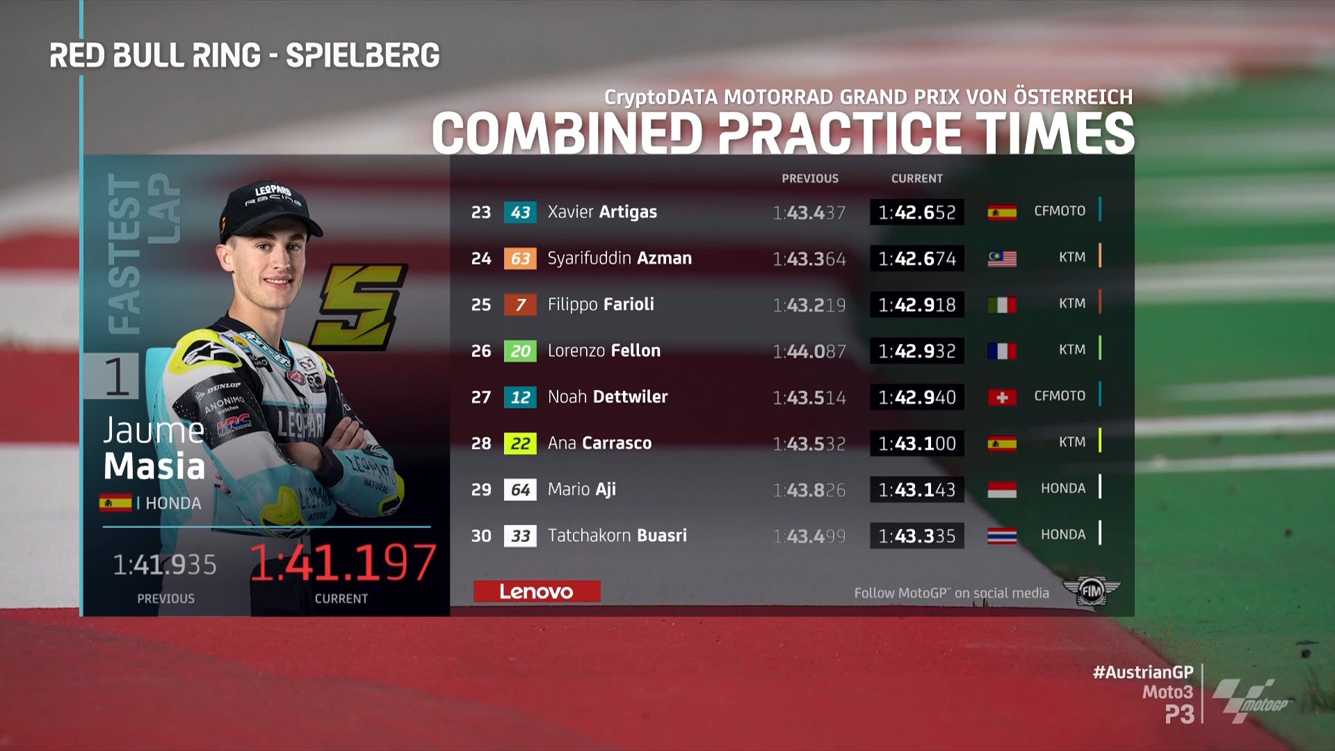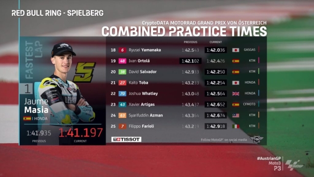 Enquanto o colombiano estava em uma liga própria, o resto do grid estava travado uma guerra normal da Moto3. O líder do campeonato Daniel Holgado teve uma sexta-feira positiva depois de liderar a primeira sessão de treinos, ficando em P4 nos combinados. O espanhol perdeu os três primeiros por 0,020s, à frente de Matteo Bertelle, que completou os cinco primeiros. Depois de cair no Grande Prêmio da Inglaterra, Jaume Masia (Leopard Racing) precisa de uma finalização sólida na Áustria para manter viva a luta pelo título. Enquanto o espanhol não estava dominando as sessões como vimos nos GPs anteriores, ele está em 6º lugar e mostrou um ritmo decente nesta prévia das corridas do fim de semana. O brasileiro Diogo Moreira fechou em P10, a 1 segundo do líder.