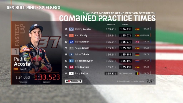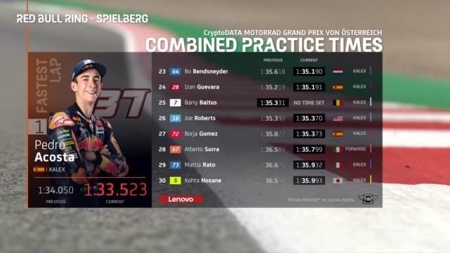 Pedro Acosta liderou a tabela de tempos no Dia 1 para o GP da Áustria, ficando a um passo do recorde de voltas com 1:34.050. A apenas 0,110s do espanhol estava Somkiat Chantra, que liderou o Treino 1 para se colocar em P2 nos combinados à frente de seu companheiro de equipe Ai Ogura, em P3.
