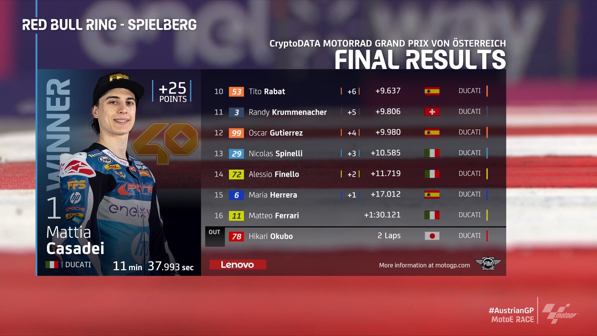 Mais uma corrida fantástica! Quando parecia que Acosta venceria com facilidade, ele passou a perder desempenho, em um momento quase caiu da moto. Acabou perdendo a P1 para o Celestino Vietti. Tentou recuperar, quando tocou sua roda dianteira na trazeira do italiano. Poderia ter sido um desastre. Neste momento deve ter entrado na cabeça, que deve estar mais madura, cabeça de possível futuro campeão da Moto2 e futuro possível piloto de MotoGP, uma informação importante, pois é melhor fazer 20 pontos do que não fazer nada, pois ele tem um título para ganhar. Ai Ogura ficou desapontado, disse que acreditava que tinha ritmo para brigar na frente, porém não foi o que aconteceu, mas mesmo assim ficou feliz com a terceira posição.