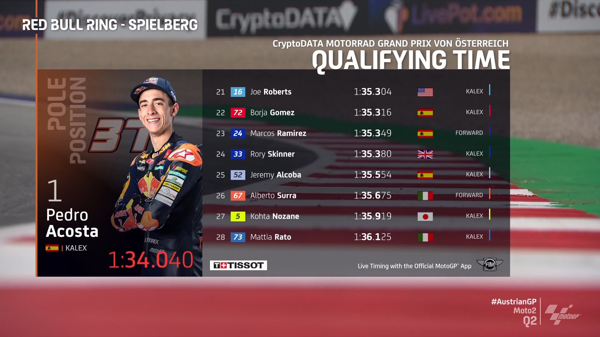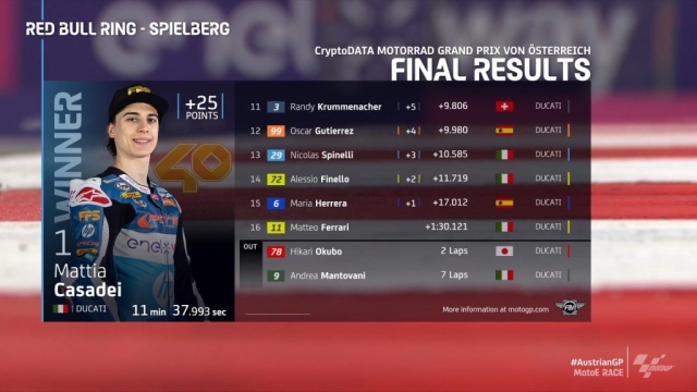 - Enea Bastianini também falou sobre sua situação atual na Áustria. Ele ficou fora da vaga direta ao Q2 e ainda sofreu uma queda na sexta-feira que complicou seus planos. Ele que pouco conhece a moto, devido a sua grave lesão sofrida em Portimão: “Esta sexta-feira poderia ter sido melhor. A princípio o dia começou muito bem, depois quando comecei a forçar voltaram os problemas habituais, dificuldades nas frenagens e nas curvas. Não consigo rodar como quero e no final até bati. É uma pena, porque poderia ter feito melhor com aquela moto, mas na curva 2 à esquerda perdi a frente e acabei no chão. Tentamos suavizar várias áreas. No TL2, fiz outra alteração para ter mais confiança ao frear na vertical, mas caí mesmo assim. É uma pena, porque não consegui fazer um ataque em tempo real e não consegui encontrar o meu verdadeiro potencial e o da moto. Estou consolado com o fato de que com pneus usados eu rodei bem e parecia que encontrei um caminho. Mas vamos ver amanhã qual será a situação. Esta é apenas a minha segunda corrida em que me sinto bem e não estou preocupado. Se a situação ainda fosse assim em cinco a seis corridas, seria um problema. Só tenho que me concentrar em fazer a corrida como um teste com o objetivo de encontrar as sensações que me faltam. Hoje tentei obter um bom resultado, mas não é o que posso aspirar.” E mesmo sabendo que ainda tem tempo, ele se preocupa por não encontrar as soluções: “devo entender por que faço tantas modificações na moto, mas nada muda. Parece que estou sempre no mesmo ponto. É uma situação delicada e o objetivo é encontrar boas sensações porque o resto não me importa. No momento em que eles chegarem, os resultados virão.”