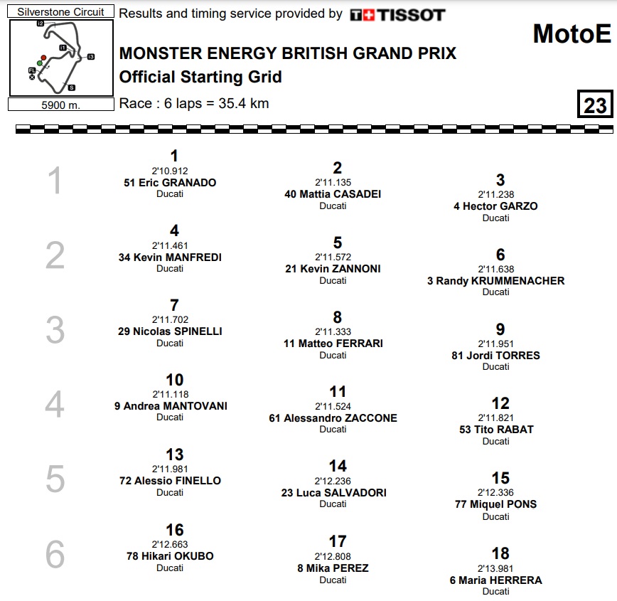 - E Granado vai largar na pole nas duas corridas da MotoE neste sábado, ambas com transmissão pelo nosso canal do Youtube. E a chance de dar uma mexida no campeonato é muito boa, afinal os dois líderes largarão mais para trás. Jordi Torres (Openbank Aspar Team) e o adversário mais próximo Matteo Ferrari (Felo Gresini MotoE) caíram nos treinos e vão largar da terceira fila. Inclusive, Ferrari também tem uma penalidade de volta longa para cumprir na corrida 1 após a queda sob bandeiras amarelas. Então, a MotoE está imperdível, iniciando as 08:10 a primeira prova do dia. Confira os acidentes AQUI