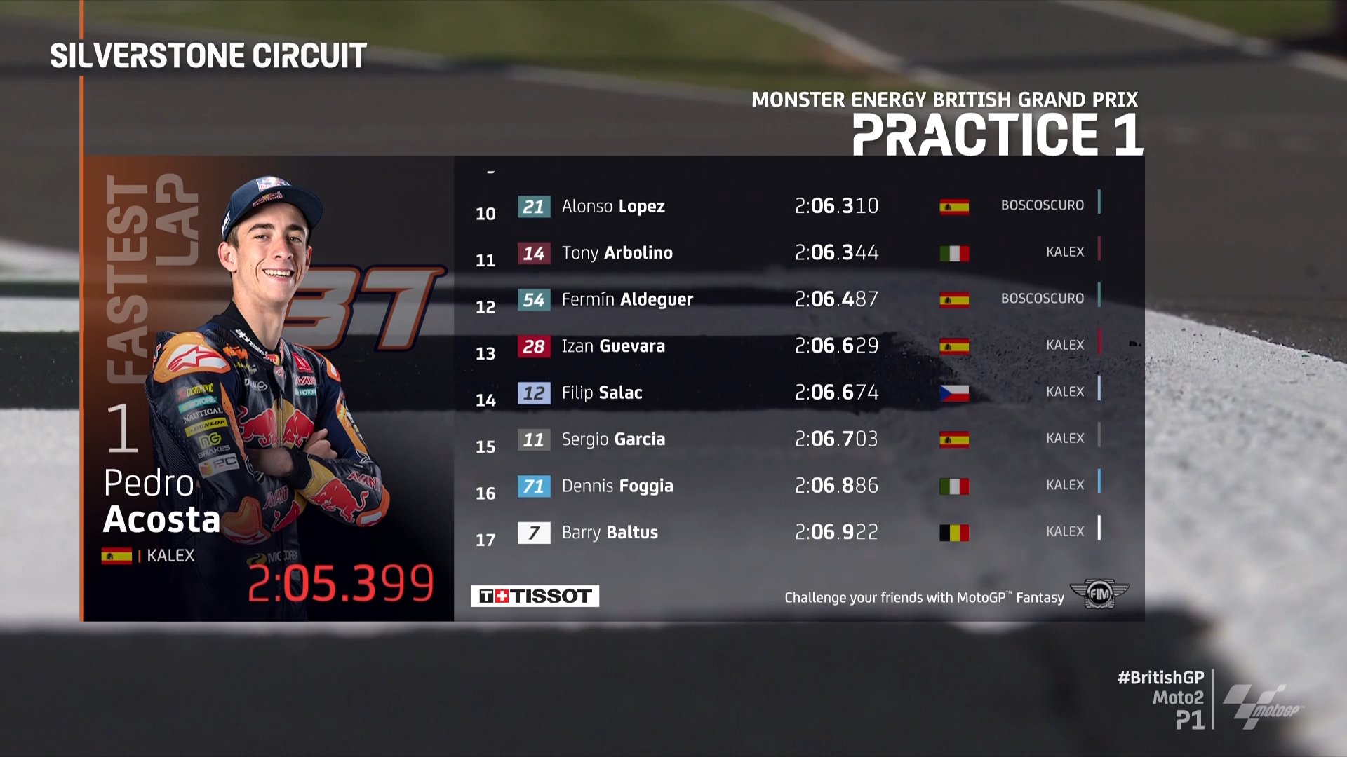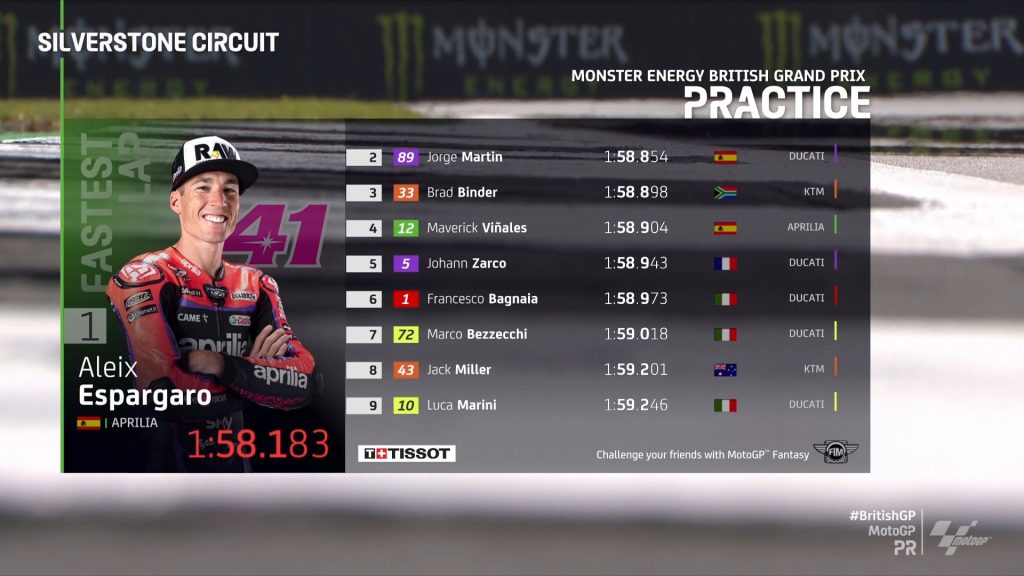 E deu ele, Aleix Espargaró, liderando os tempos em P1. Jorge Martin em P2 e Brad Binder em P3. O top 10 fecha com: Viñales (P4), Zarco (P5), Bagnaia (P6), Bezzecchi (P7), Miller (P8), Marini (P9) e Alex Marquez (P10). Quartararo, Marc Marques, Morbidelli e Miguel Oliveira vem na sequência, porém fora do Q2.