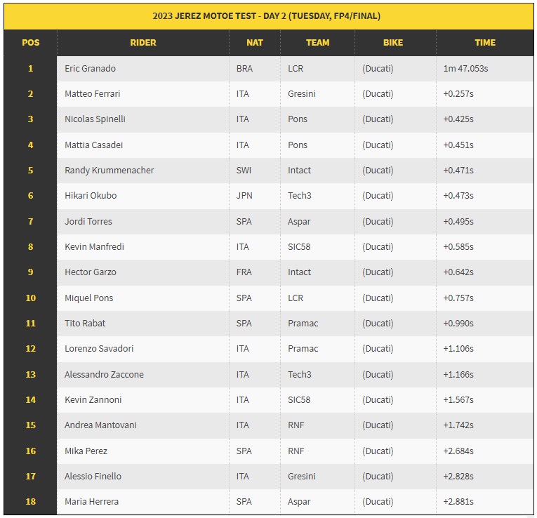 A sessão três de quatro foi a primeira saída da semana que permitiu o uso de pneus slick, enquanto o pelotão de MotoE continuava a se familiarizar com a nova e impressionante motocicleta V21L da Ducati. Então, na quarta e última sessão do dia, os tempos caíram quando um novo recorde de volta da MotoE foi estabelecido em Jerez, um impressionante 1:47.053 do vice-campeão de 2022 Eric Granado (LCR E-Team).