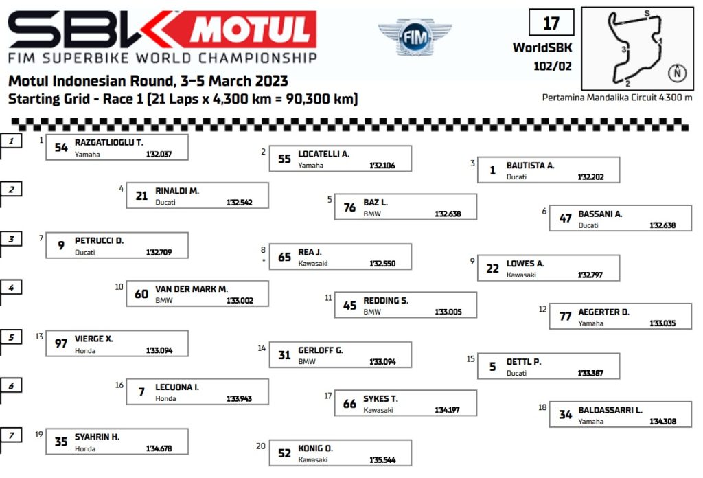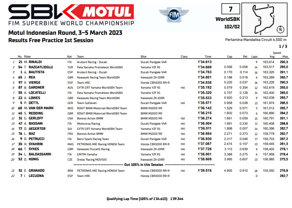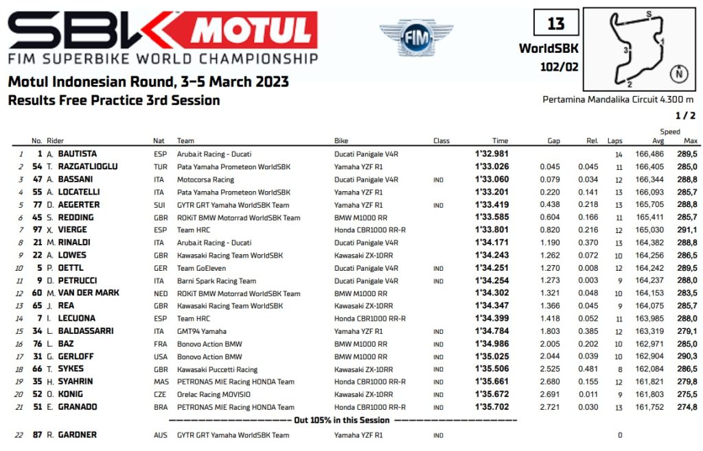 Foi um atraso na ordem de Michael van der Mark (ROKiT BMW Motorrad WorldSBK Team), com o holandês a menos de três quartos de segundo do melhor tempo de Rinaldi. O # 60 estava apenas 0,010s atrás de Rea diretamente à sua frente em quarto, enquanto mostrava o potencial da BMW M 1000 RR em Mandalika, um circuito onde esteve no pódio – em 2021 no molhado com van der Mark. O companheiro de equipe Scott Redding teve um desempenho um pouco melhor do que em Phillip Island e terminou o dia em décimo, 1,277s atrás do ex-companheiro de equipe da Ducati Rinaldi na liderança dos tempos.