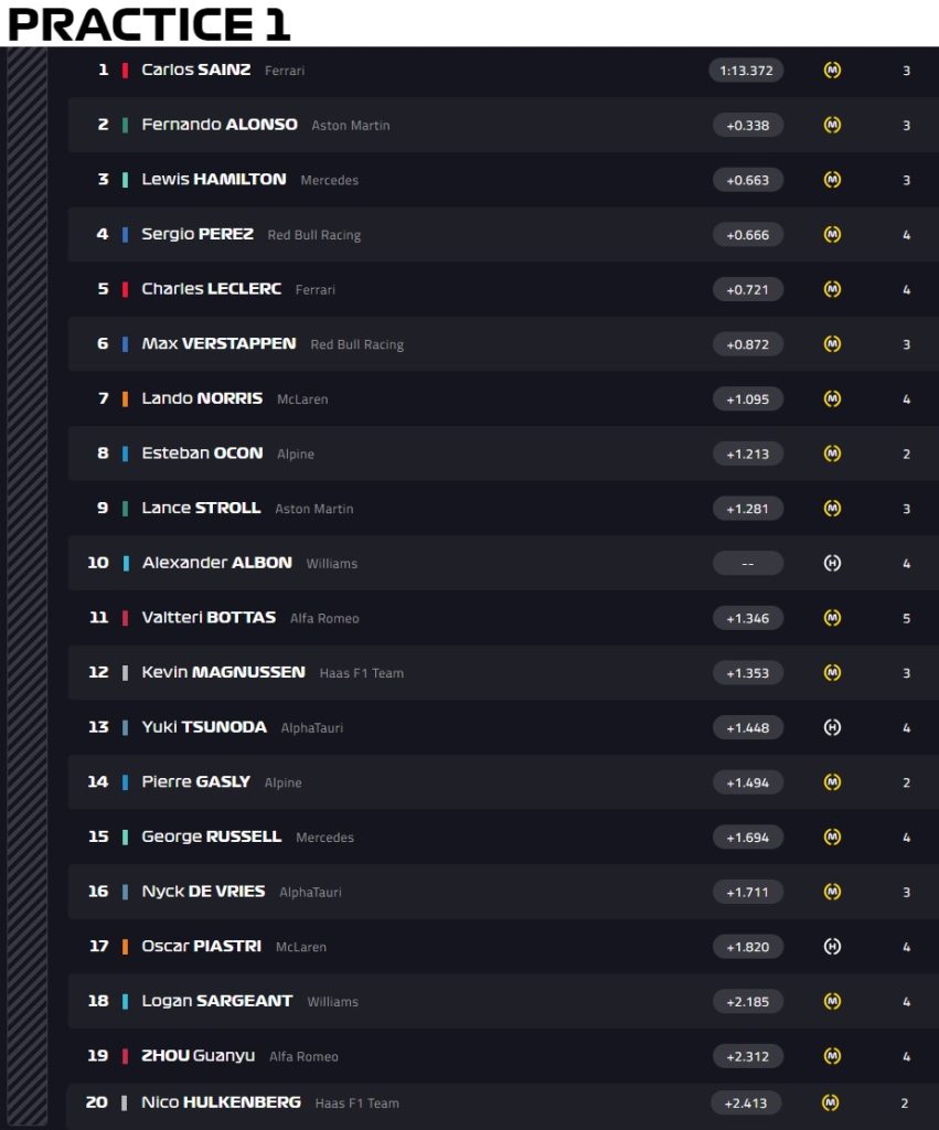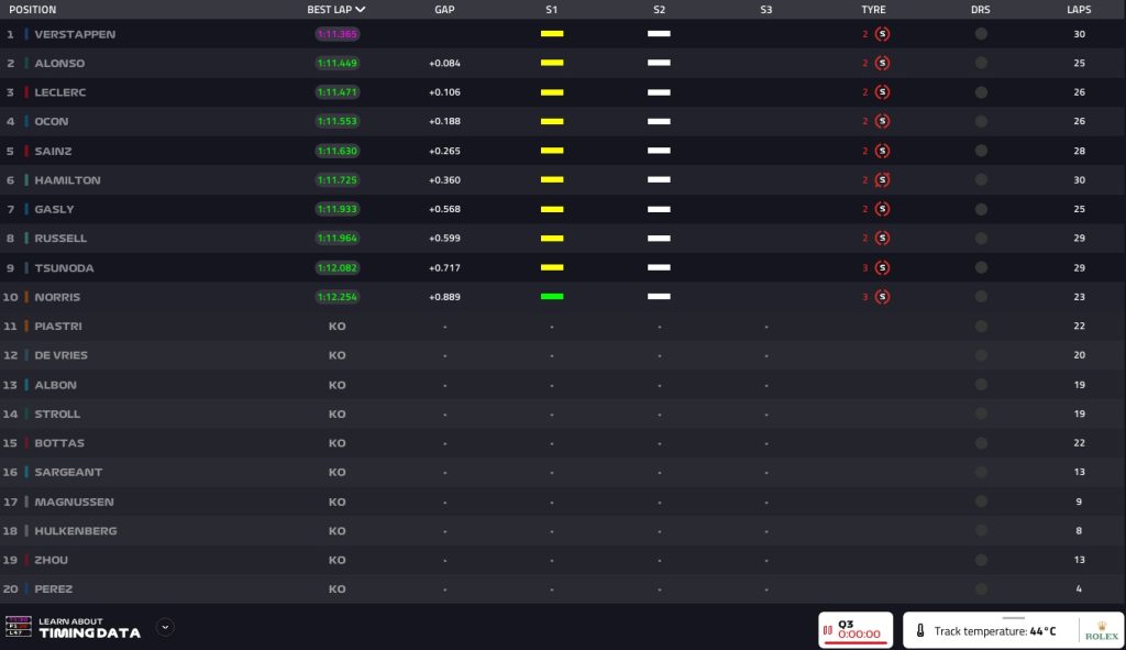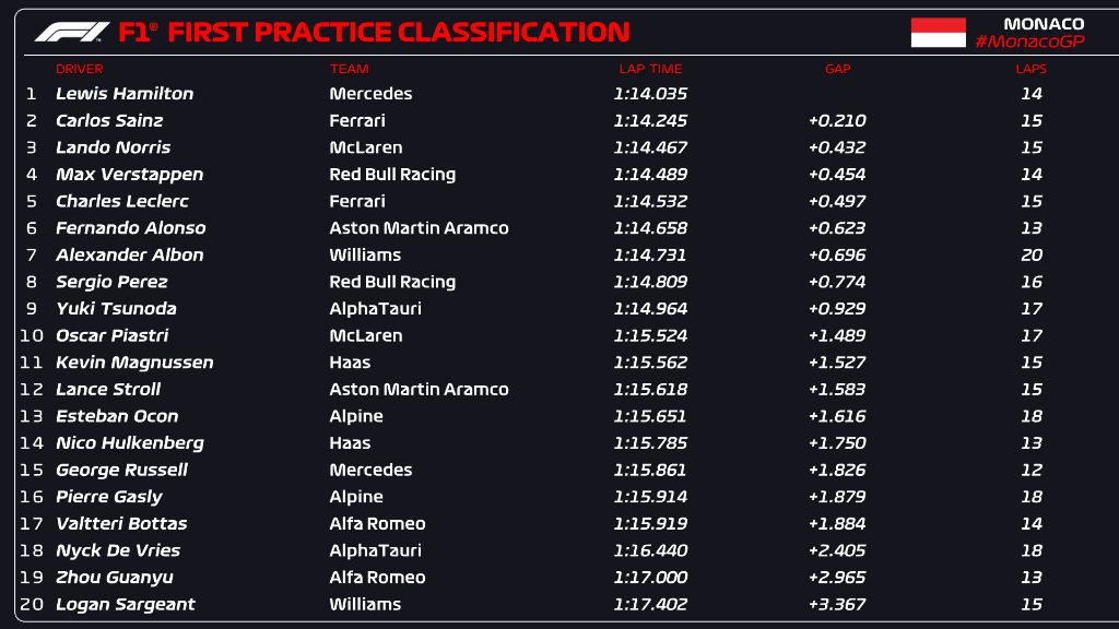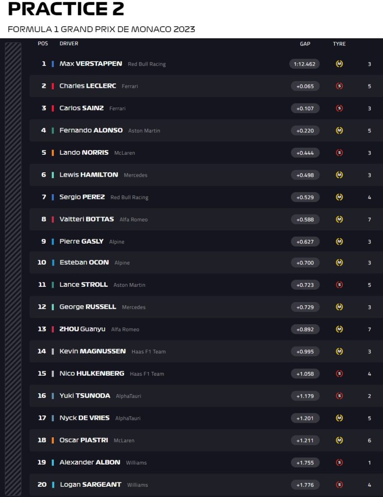 No destaque, além de Max em P1, destaque para as Ferraris com Leclerc em P2 e Sainz em P3, que deverão brigar pela pole position, que em Mônaco é mais importante do que em qualquer lugar. E Alonso também, por que não? Outro destaque vai para Lando Norris em P5, que mesmo com um carro que já se mostrou ruim, está ai, brigando e terminando bem posicionado. Hamilton faz seu trabalho ficando em 6º, com seu colega Russel apenas em P12. Outro destaque negativo foi Perez, terminando apenas em P7.