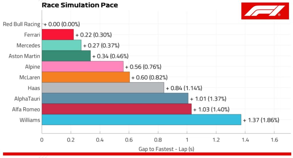 - Ferrari mantém vantagem sobre Red Bull em ritmo de uma volta – todos sabemos que classificar bem em Mônaco é muito importante, e a Ferrari faz isso bem. Mas o ritmo cai bastante quando colocam combustível no tanque. A Ferrari tem cerca de 0,08s na Red Bull com base nos dados de qualificação. Isso não é nada lá, mas se eles conseguirem manter isso no sábado, conseguir uma volta limpa no ritmo final os torna fortes candidatos à pole position.