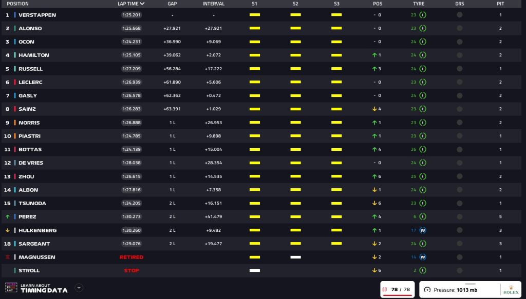 Nem a chuva atrapalhou a dominante vitória de Max Verstappen. Largando com médios conseguiu levar os pneus mais longe do que Fernando Alonso com duros. As paradas dos primeiros colocados acontecendo junto com a vinda da chuva. Perez que se cuide, pois o Alonso está chegando para brigar pela segunda posição. Com relação a primeira, praticamente já dá para entregar a taça ao P1 de hoje.