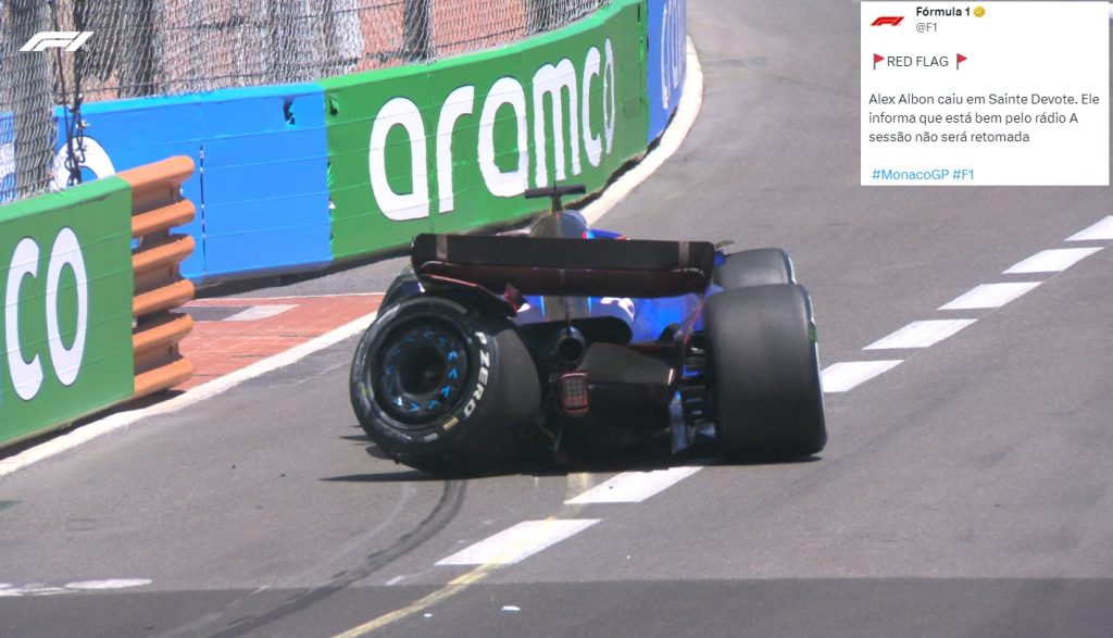 Albon destrói sua Williams na primeira curva, a Sainte Devote, a poucos minutos o fim e assim encerramos o treino em bandeira vermelha. Dará trabalho aos mecânicos, mas ele está bem, em 10º.