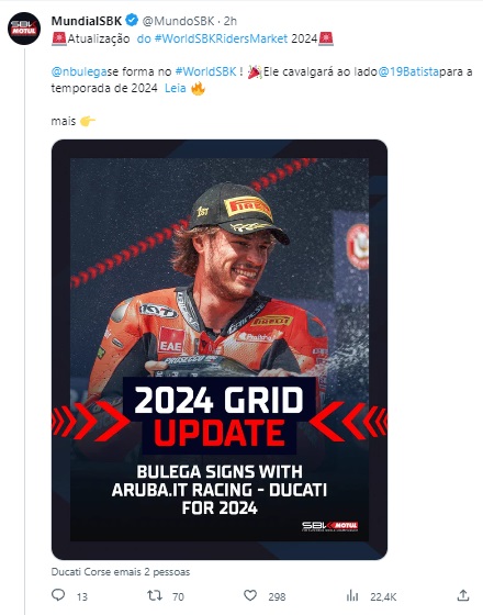 - Bulega vem ai! O líder do Campeonato Mundial de Supersport irá para a equipe Aruba.it Racing – Ducati para o próximo ano nas SBK, em parceria com o atual campeão e líder do campeonato, Alvaro Bautista e no lugar de Michael Ruben Rinaldi, cujo futuro na equipe Ducati está chegando ao fim depois de três temporadas, três vitórias e 16 pódios até o momento. Bulega saiu do paddock de MotoGP depois de competir em 50 corridas de Moto3, conquistando dois pódios e duas pole positions, bem como três temporadas na Moto2 onde não conseguiu mostrar o seu potencial. Porém agora em 2023 a Supersport vem trazendo destaque a ele: já são 9 vitórias em corridas neste ano, sendo 3 vitórias duplas.