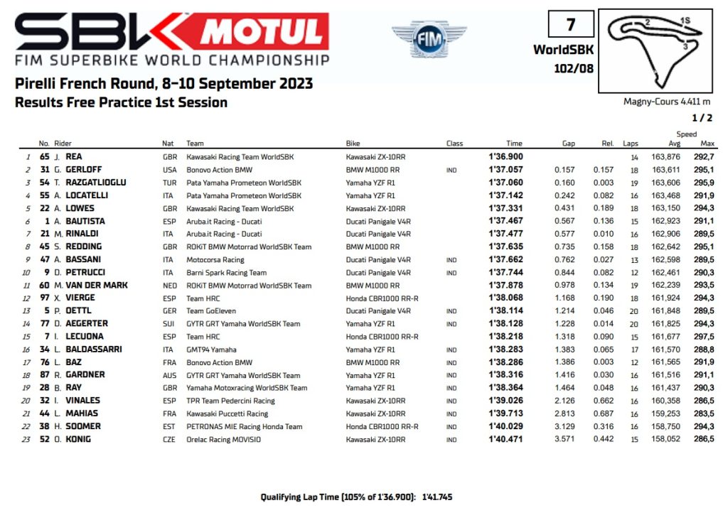 Após fechar com a Yamaha para 2024, Rea vem motivado e fecha em P1 no TL1 na França. Gerloff faz P2 com Toprak em P3. O líder isolado do campeonato, Bautista, é apenas o P6. Mas claro que esse é apenas o primeiro treino do dia.