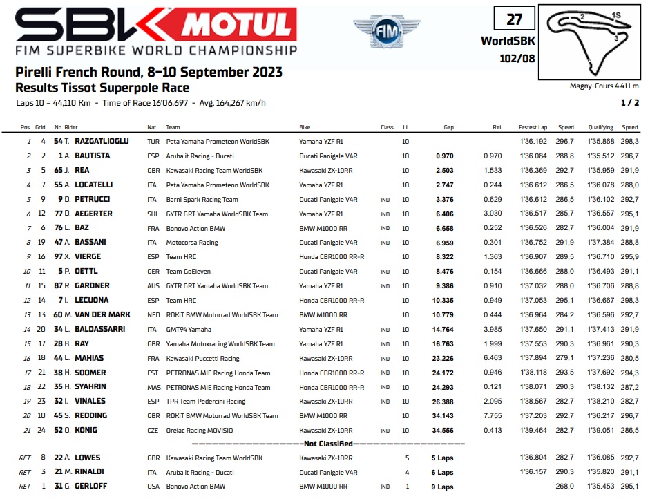 - Com os problemas de Bautista, ficou um pouco mais fácil para Toprak Razgatlioglu (Pata Yamaha Prometeon WorldSBK) conquistar sua sétima vitória no circuito francês para diminuir a diferença no campeonato. Porém “esqueceram de avisar Rinaldi”. O #54 lutou muito para chegar à frente antes de resistir à pressão do companheiro de equipe de Bautista, Michael Ruben Rinaldi, para conquistar uma vitória difícil durante a Rodada Francesa da Pirelli. O campeão de 2021 largou do quarto lugar no grid, mas imediatamente esteve na disputa pela liderança com um lançamento soberbo e, enquanto o número 1 estava à frente nas primeiras voltas, Razgatlioglu avançou sobre seu rival na volta 2 na curva. 13. Bautista ficou perto da estrela turca, mas caiu na ordem quando teve o problema citado acima. Refletindo sobre a sua vitória e a luta pelo título, Razgatlioglu disse: “Estou feliz por vencer novamente em Magny-Cours, pois é uma das minhas pistas favoritas! Vencemos como no ano passado e, da mesma forma, lutando com o Michael! De qualquer forma, um grande obrigado à equipe porque trabalharam muito bem este fim de semana e demos um passo. Não basta ser bom na rfenagem, é preciso mais potência à saída das curvas, principalmente nas lentas. Todo mundo sabe que a Ducati é muito boa nas retas, mas continuaremos lutando! Vi que o Álvaro estava com alguns problemas técnicos; Não estou pensando no Campeonato, estou focado corrida após corrida, pois preciso vencer. Esqueço-me do Campeonato. Temos mais duas corridas no domingo. Estou mais tranquilo que o Álvaro porque não penso no Campeonato. Se vencermos todas as corridas, seremos campeões mundiais. Em 2021, foi assim que pensei e é assim que ainda penso. Vamos apenas tentar aproveitar cada corrida.”