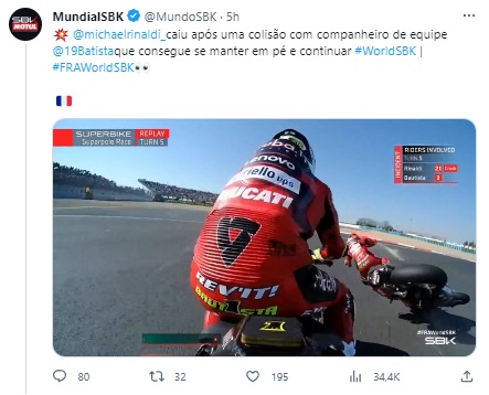 - Álvaro Bautista teve problemas na Corrida 1 que surpreendeu a todos. A máquina Ducati simplesmente apagou. Ele conseguiu rapidamente fazer funcionar novamente, mas teve que lutar para abrir caminho por todo o pelotão das SBK e finalmente ainda conseguiu terminar em décimo lugar, limitando os danos na classificação do Campeonato com a vitória de Razgatlioglu. A oscilação entre a dupla foi de 19 pontos a favor do #54. A diferença é agora de 55 pontos entre eles, faltando 11 corridas para o final. Explicando o que aconteceu na Corrida 1, Bautista disse: “Foi uma tarde estranha. De manhã tive boas sensações e fizemos uma volta muito boa na Superpole e a moto estava fantástica. No final, escolhemos o composto mais macio na traseira naquele momento porque, de manhã, me senti bem, então achei que era uma boa escolha para a corrida. Tive uma boa largada, mas de repente senti que o motor estava com alguns problemas porque senti que a potência estava muito baixa. Nas duas primeiras voltas, o motor não estava funcionando normalmente. Quando cheguei à curva 5 na volta 3, reabri o acelerador e o motor parou. Pensei que talvez a potência não estivesse boa nas duas primeiras voltas porque havia um problema. Quando parei a moto, li uma mensagem no display informando que ela estava ligada, apenas o motor parou. Li uma mensagem que dizia que eu poderia começar. Foi a mensagem que os mecânicos veem quando ligam a moto. Tentei ligar a moto e partir, o motor ligou novamente e pensei em ir até o box com a moto. Mas a moto começou a funcionar normalmente. A energia estava normal. Acabei de fazer a corrida e estou feliz com o desempenho e porque me diverti muito pegando os pilotos e ultrapassando todos eles! Sem esse problema, talvez pudéssemos lutar pela vitória.”