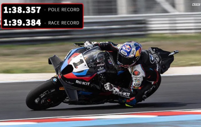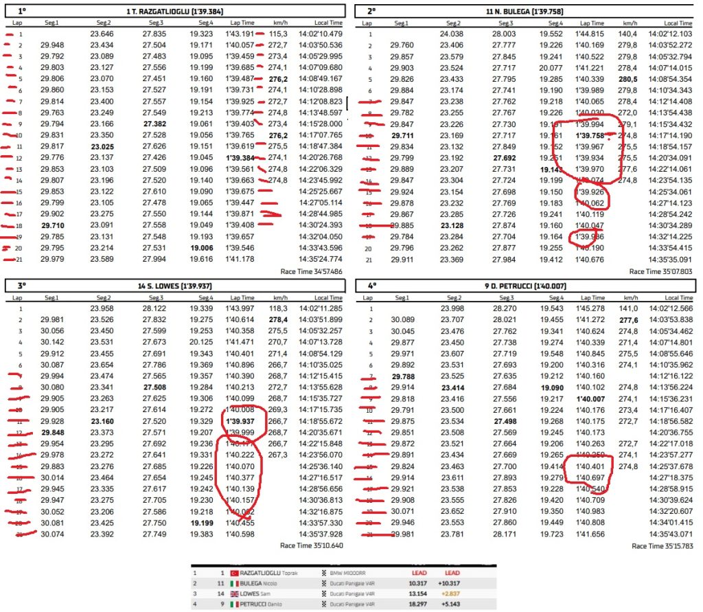 Mas mesmo assim, podemos comparar. Essa primeira imagem é sobre a análise volta a volta que fizemos da Corrida 2 do Mundial Superbike, cujo vídeo está aqui no card. Nela vemos a volta mais rápida da corrida, sendo feita pelo vencedor, Toprak Razgatlioglu. com 1:39.384, isso portanto, em ritmo de corrida. A pole position, foi do turco também, em 1:38.347. Peco Bagnaia, em seu track day, com sua Ducati Panigale V4 S, fez 1:41.468. E essas comparações são sempre inevitáveis, mas temos que lembrar que são categorias completamente diferentes. Assim como uma moto de rua ou uma moto que não é a utilizada no WSBK, como podemos considerar a V4 S, não tem nada a ver com a moto do Superbike, a moto do Superbike também não tem nada a ver com a Moto de MotoGP. As diferenças são enormes e requer também adaptação, e lembramos bem quando os pilotos de MotoGP participaram de um teste oficial do Superbike no ano passado em Portimão, naquela oportunidade em que Morbidelli acabou caindo e se machucando, atrapalhando sua temporada. Eles ficaram atrás nos tempos dos pilotos de Superbike, o que comprova essa necessidade de adaptação. Portanto não é assim como muitos pensam, sou MotoGP, ou chegar lá e vou ganhar de todos. E ficaremos sempre com aquela curiosidade em saber o que este ou aquele piloto fariam nesta ou naquela competição. Podemos então, apenas imaginar.