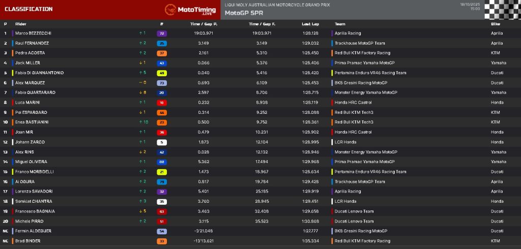 Com uma excelente largada de Raul Fernandez ele assume a ponta e mostra força, porém temos outra Ducati forte: Marco Bezzecchi. Mesmo atingindo uma gaivota que infelizmente morreu e ficou presa na sua moto, Marco Bezzecchi concluiu a perseguição a Fernandez com sucesso, vencendo a Sprint, apesar de um erro que cometeu na primeira tentativa. Porém para domingo ele terá um forte adversário, seu colega de Aprilia, pois lá ele terá que pagar duas voltas longas. Pedo Acosta faz excelente corrida, segurando Jack Miller e Fabio Di Giannantonio para garantir o pódio. Peco Bagnaia terminou em P19, a frente apenas do Pirro, foi visto de cabeça baixa ainda de capacete no bóx da Ducati. Surreal o que acontece com ele.