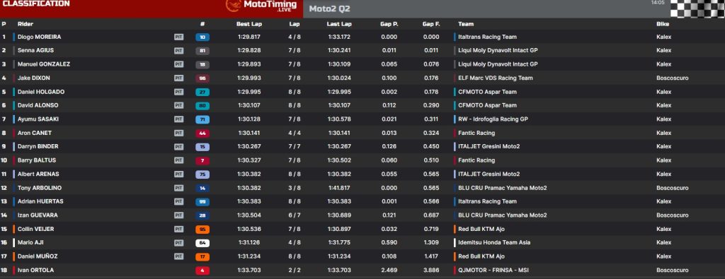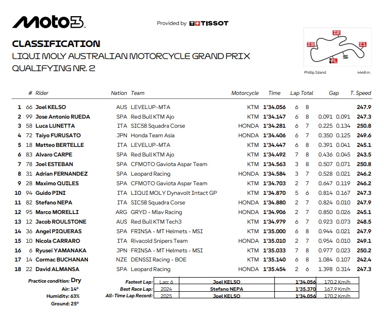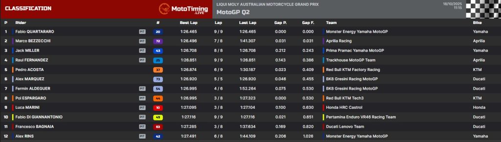E Fábio Quartararo ataca novamente e faz a pole position para o GP da Austrália. Marco Bezzecchi que parecia que iria levar, ficou em segundo, ele que terá que pagar volta longa na corrida, com Jack Miler em P3. São duas Yamaha na primeira fila e desde 2012 um piloto australiano não fazia largada na primeira fila em casa. Fantástico. A segunda fila tem Fernandez, Acosta e Alex Marquez, que caiu duas vezes, prejudicando seu treino. Fermin Aldeguer também não foi bem e abre a terceira fila, que tem também Pol Espargaró e Luca Marini. Bagnaia novamente decepciona e largará em P11, com outra decepcionante posição para Digia, a sua frente em P10.Rins é o P12,