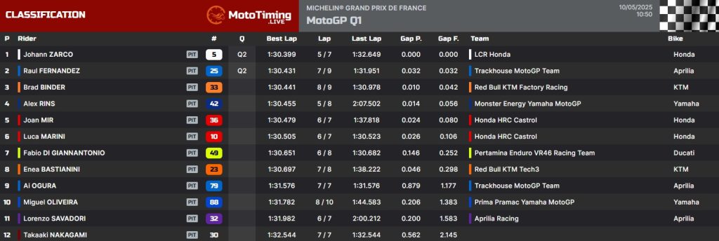 Na Qualificação 1 da MotoGP, tivemos Johann Zarco e Raul Fernandez conquistando as duas vagas disponíveis para a Qualificação 2 para o GP da França e para a Sprint. A grande supresa é Raul Fernandez e decepção, novamente, é Fabio Di Giannantonio, que com a moto que tem, precisa fazer mais. É a unica Ducati fora do Q2.