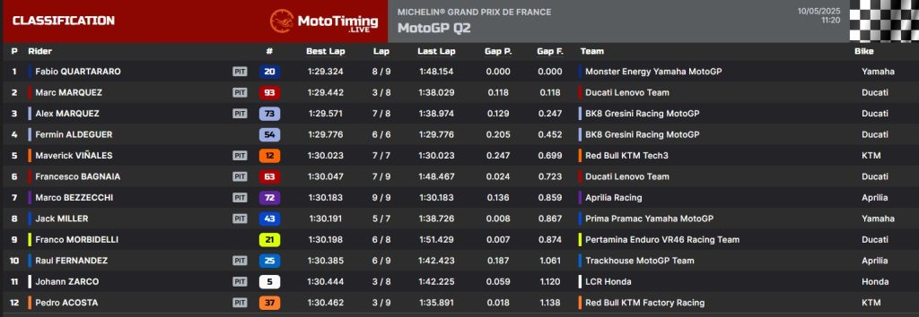 Tivemos várias quedas, como Morbidelli, Zarco e Aldeguer, este último estava em P2 quando a queda impediu uma posição melhor de largada, apesar de vir de P4. Bagnaia vai largar em P6, fechando a segunda fila.