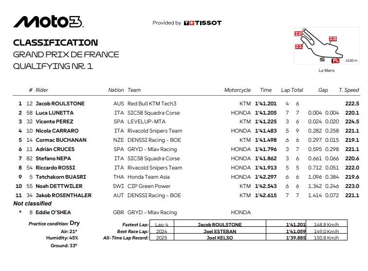 Roulstone, Lunetta, Perez e Carraro são os 4 classificados ao Q2 da Moto3.