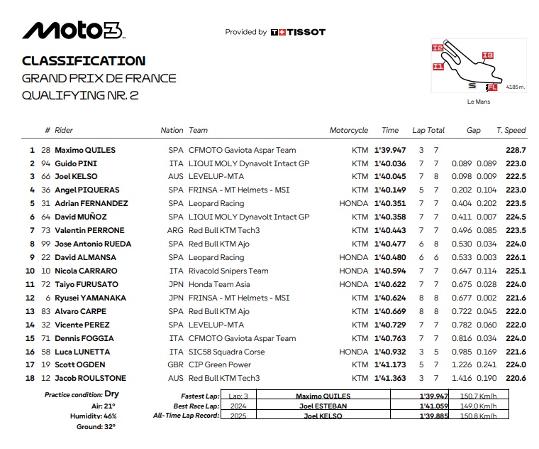 E o garoto está de volta. Maximo Quiles faz a pole para o GP de Lemans da Moto3. Pini e Kelso largam do lado.