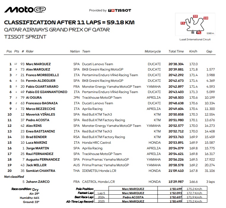 Peco disse após corrida: “Se eu posso fazer isso no domingo, eu também devo fazer no sábado. Ontem foi mais ou menos como sempre. Na corrida Sprint, não posso ser agressivo da mesma forma. Não consigo sentir o mesmo desempenho que estou tendo no domingo; devo melhorá-lo. Talvez saibamos o caminho a seguir. É algo que tenho de melhorar porque é evidente que é um dos meus pontos fracos. Além disso, eu estava me esforçando muito para diminuir a diferença. Não foi fácil do P11. Talvez eu tenha forçado demais a retaguarda e também a briga com Franky nos fez perder um pouco de tempo demais. Quando eu estava lá, perdendo e tentando voltar, fiquei sem o pneu traseiro. Tentei terminar da melhor forma possível mas não bastava diminuir a diferença e tentar vencer a corrida.” Ele que realmente fez uma otima corrida, como ele mesmo achou, porém o problema foi no sábado, tanto na Sprint como na qualificação, pois largar la de traz dificulta muito as coisas. Mas não impossibilita, pois Marc fez isso várias vezes em 2024. Sobre a Sprint ele diz que o problema deve ser com relação ao tanque de combustível menor, pois ele diz que a moto fica diferente. Mas o Marc não sente isso, temos que lembrar aqui.