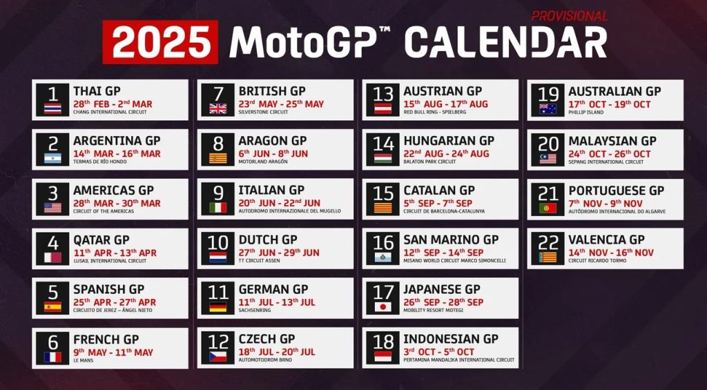 O calendário provisório do Campeonato Mundial de MotoGP™ da FIM de 2025 foi publicado pela FIM, revelando as datas e corridas para a próxima temporada do esporte mais emocionante da Terra. 22 Grandes Prêmios em 18 países devem ocorrer em 2025, incluindo o retorno de Brno na República Tcheca e a estréia do Balaton Park na Hungria. Projetado para que os fãs desfrutem do melhor da MotoGP onde quer que estejam no mundo, o calendário é o mais eficiente possível, ao mesmo tempo que equilibra fatores sociais e económicos para maximizar o nosso impacto positivo.