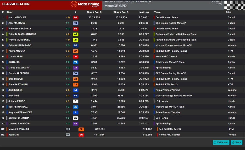 O resultado deu a lógica, vitória de Marc Marquez. Porém houve problemas, com ele primeiramente embolado com Alex e Peco na curva 1, nos entregando uma boa disputa e depois errando enquanto liderava, ainda no começo da prova e quase caindo. Foi uma boa salvada. Mas logo depois a supremacia se manteve, Marc abriu e realmente está mostrando que é diferenciado. Uma pena para Joan Mir que caiu enquanto fazia uma boa prova para si e para a Honda. Quem também abandonou, este com problemas técnicos, foi Maverick Viñales, após quase bater na frenagem da curva 12, foi um momento perigoso. Quartararo fez uma boa Sprint, brigou com as VR46 mas sucumbiu acabando atrás delas em P6. Se ele tivesse uma moto mais forte certamente seria tudo diferente, mas a MotoGP não vive de “SEs”. Pedro Acosta terminou em um modesto P7, a frente de Luca Marini (P8), Ai Ogura P9 e Bezzecchi fechando os 10.