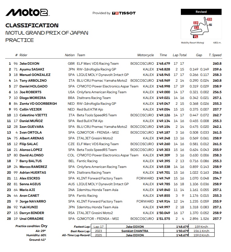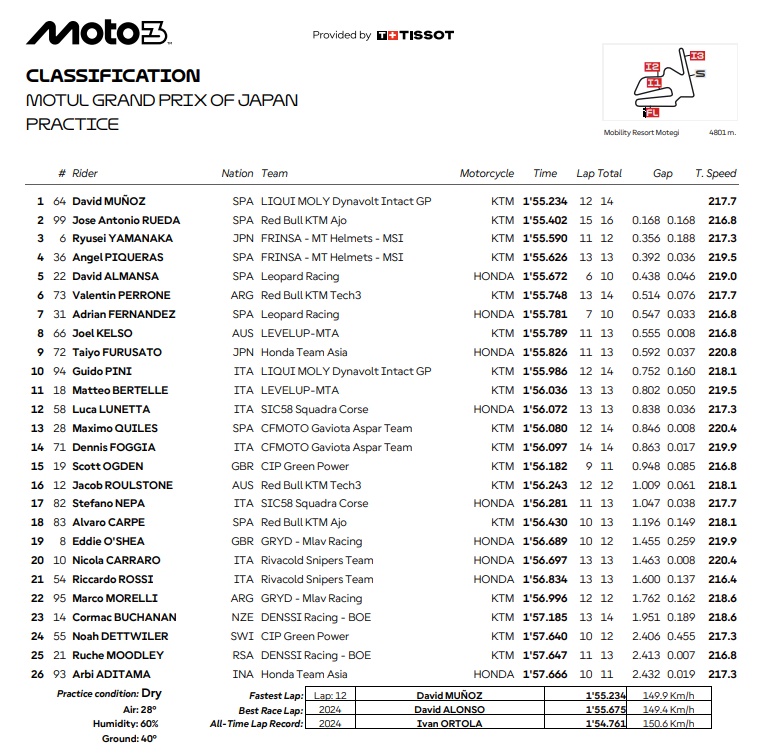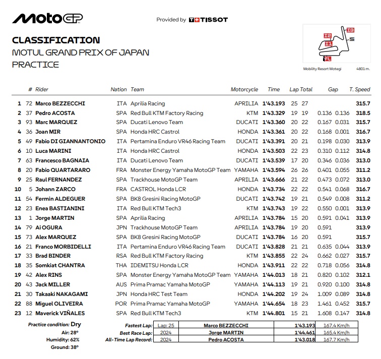 Marc Marquez não teve o habitual brilho na sexta-feira, esteve sempre abaixo na tabela de tempos, mas conquista sua vaga ao Q2 na terceira posição, atacando nas últimas voltas. Ele, inclusive, é o único piloto em 2025 a ir ao Q2 todas as vezes. Quem brilhou foi Bezzecchi, sendo o mais rápido. Pedro Acosta fecha em segundo. Destaque para Bagnaia, que liderou o FP1 e chegou a liderar o treino qualificatório, mas terminou em P7, ele que estreou uma nova carenagem. Seria esse o seu segredo? Os demais qualificados são Mir, Digia, Marini, Quartararo, Fernandez e Zarco.