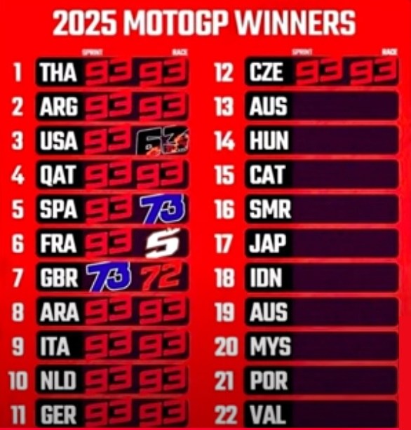 Então é isso: Marc gostou. E não poderia ser diferente, afinal ele se adapta muito bem em qualquer pista, basta ver os resultados do Mundial 2025. Não a toa é o líder do campeonato. Em anexo você vê essa imagem onde só dá o número 93.