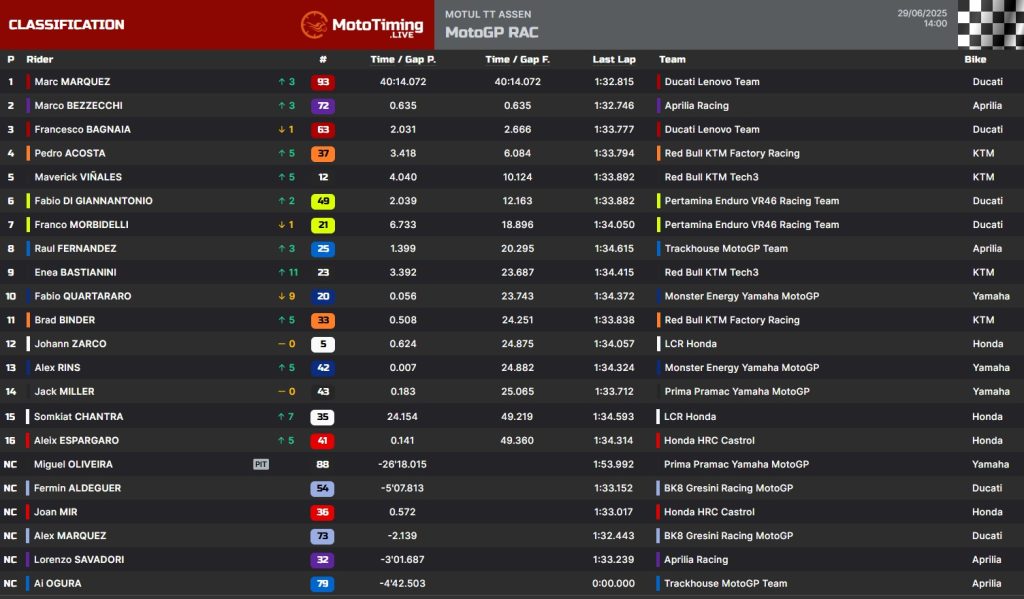 O domingo que já foi sensacional para nós brasileiros com a vitória na inteligência para Diogo Moreira, terminou sensacional também na MotoGP. Peco Bagnaia pegou a ponta no começo e ali ficou por algum tempo, mas terminou como sempre: sem ritmo no final. Mas ainda assim garantiu o pódio em terceiro. Alex Marquez perdeu posições no início e em uma disputa com Pedro Acosta, acabou por cair, aparentemente freando mais que devia a roda dianteira, vindo ao chão quebrando o dedo da mão direita, o que pode complicar sua corrida no campeonato. A mão dele pegou no freio dianteiro e o protetor que ali tem não teve o efeito desejado. Mais uma queda parecido para ALex, que precisa aprender aquela frase famosa: corrida não se ganha em uma curva, mas se perde. Bezzecchi logo assumiu a segunda posição e foi bem interessante, pois o conjunto de Noale ficou sempre perto de Marc Marquez, chegando a estar a quase 1 décimo em várias oportunidades, porém mesmo dando o seu máximo, Bezzecchi não foi capaz de vencer o conjunto Ducati pilotado por Marc Marquez. Mais uma vitória do super campeão espanhol, em uma pista que ele não gosta, imagina então na próxima: Alemanha em Sachsenring.
