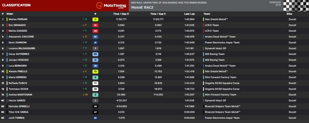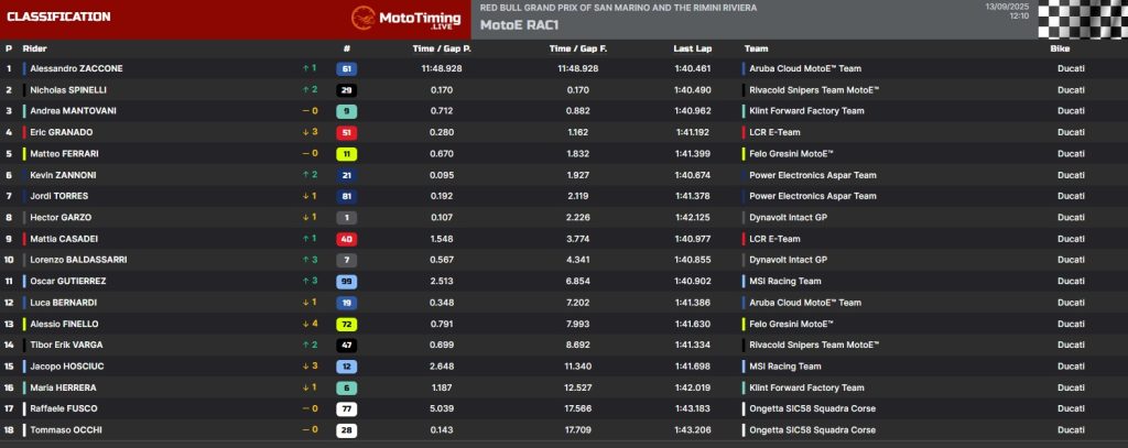 Corrida boa e movimentada na MotoE. O pole Granado perdeu a posição para Zaccone na largada, ele que apesar de ser ameaçado por Spinelli, não entregou mais. Zaccone disse que se sentiu para a vitória desde de manhã, mas apesar disso, vencer é outra coisa. Mas deu certo. Spinelli fecha em segundo e Eric Granado, que brigou bonito pela terceira posição fica em quarto, com Mantovani guerreiro, fechando o pódio.