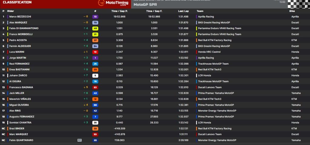 Corrida boa, bem disputada, onde tínhamos um Marc Bezzecchi aparentemente com ritmo para vitória. Porém isso se provou errado quando Marc Marquez o ultrapassou com relativa facilidade. Mas essa P1 do líder do Mundial durou pouco, ele veio a cair logo depois escapando de dianteira. Com isso Bezz não teve adversário para a vitória. Essa é sua primeira vitória desde 2023. Alex até se aproximou no final, provavelmente por um erro de Bez que logo depois abriu novamente. Vitória por 1 segundo. Muito bom. As VR46 brigaram pelo pódio, e quem levou foi Digia, Morbideli estava claramente inferior a Digia, apesar da disputa. Pedro Acosta fica apenas com a quinta posição e não pode brigar por mais, sendo ameaçado, inclusive, por Aldeguer, que chegou em P6. Bagnaia é apenas o P13, mais um resultado melancólico para o bi-campeão do mundo, que agora já não tem mais chances matemáticas de título. O V4 da Yamaha, com Augusto Fernandez, mostrou que ainda tem muito a melhorar, terminando a 27 segundos do líder, sendo a pior Yamaha, sem contar Quartararo, que caiu quando era o P4. Para o Rins, a segunda pior Yamaha, o V4 perdeu por 9 segundos.